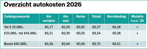 VZR publiceert jaarlijks normbedragen voor een reële kilometervergoeding als je met een privéauto zakelijke kilometers maakt. Deze vergoeding is voor een middenklasse auto met een catalogusprijs tussen €25.000 en €45.000 minimaal € 0,38 per kilometer.